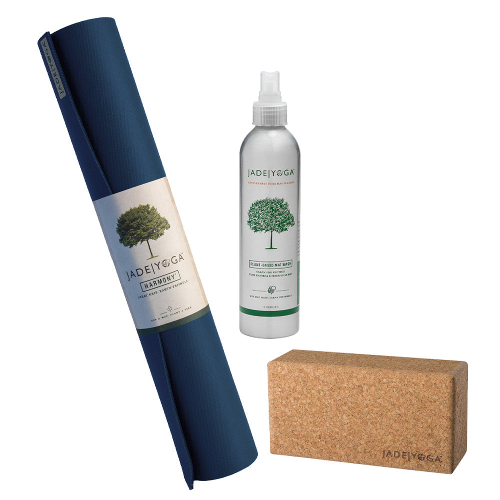 Begin your yoga practice with this thoughtfully curated Jade Yoga Starter Kit, which includes the Jade Yoga Harmony Mat in Midnight, a Small Jade Yoga Cork Yoga Block, and an 8 oz Plant-Based Mat Wash.